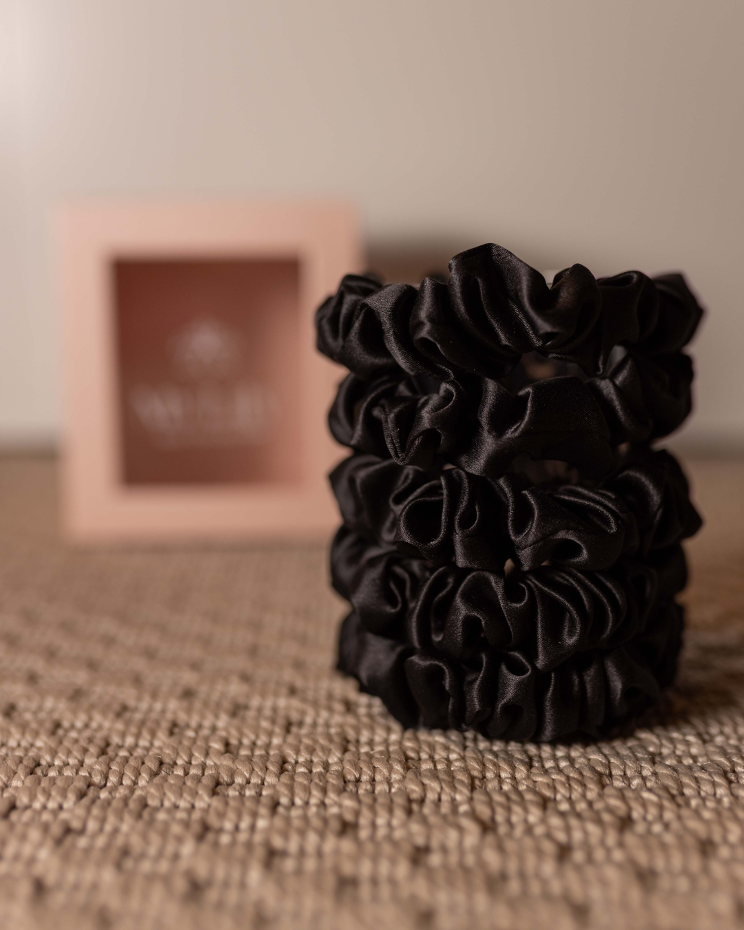 The Midnight Black silk scrunchie set is curated to blend seamlessly, featuring five deep‑black slim scrunchies. Crafted from smooth, high‑quality silk, they reduce friction, help minimize breakage, and support moisture retention.