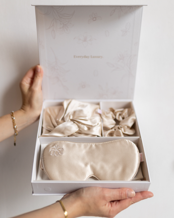 The Radiance Gift Set is a beautifully curated trio designed to elevate everyday self-care.Featuring a silk eye mask, large silk bonnet, and a jumbo silk scrunchie, each piece is crafted from high-quality mulberry silk to care for hair and skin overnight.